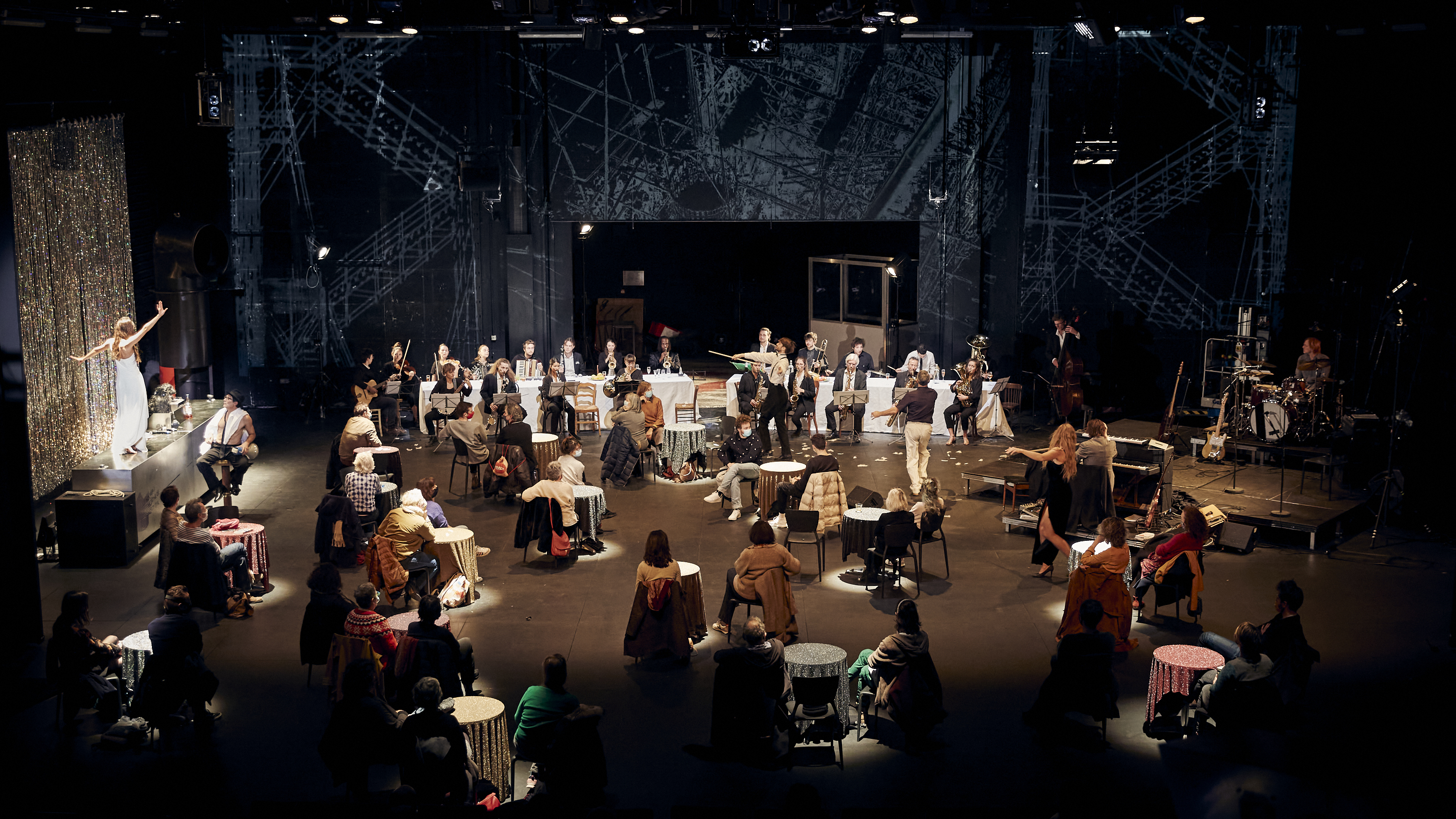« L’Œil », c’est Federico Fellini (1920-1993), cinéaste de la démesure et de l’imaginaire. « L’Oreille », c’est Nino Rota (1911-1979), compositeur habité par la grâce. Ensemble, ils ont atteint des sommets. Mathieu Bauer et le musicien Sylvain Cartigny offrent une traversée de leurs vingt-six années de collaboration, ponctuées de chefs-d’œuvre. Dans un décor de cabaret, les numéros se succèdent à la manière du music-hall emmenés par le fringant Stéphane Chivot. La mezzo-soprano Pauline Sikirdji et les acteurs Eleonore Auzou-Connes, Romain Pageard et Gianfranco Poddighe endossent des silhouettes felliniennes, baroques, clownesques ou tragiques. La musique, bien sûr, est la vedette : de la ritournelle délicate de La Strada aux mouvements symphoniques de Prova d’Orchestra en passant par les marches entêtantes de Huit et Demi. Les morceaux sont interprétés par trois musiciens et l’intrépide Orchestre de spectacle de Montreuil au grand complet. Cet hommage cinéphile et mélomane joyeux est à partager pendant la période de Noël, et une soirée toute particulière sera imaginée pour le nouvel an !